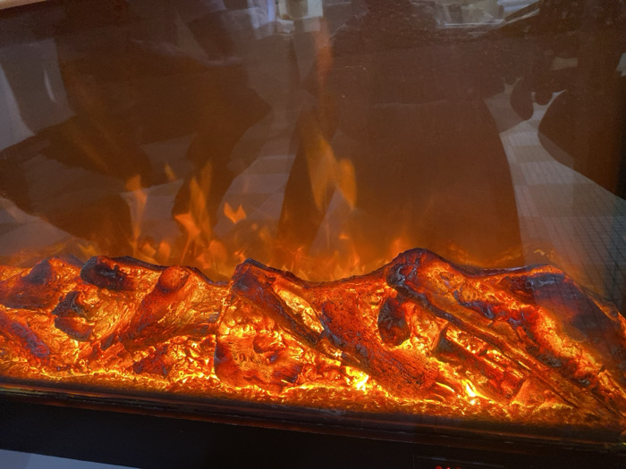 A glowing electric fireplace features faux logs with vibrant orange and yellow flames flickering behind them