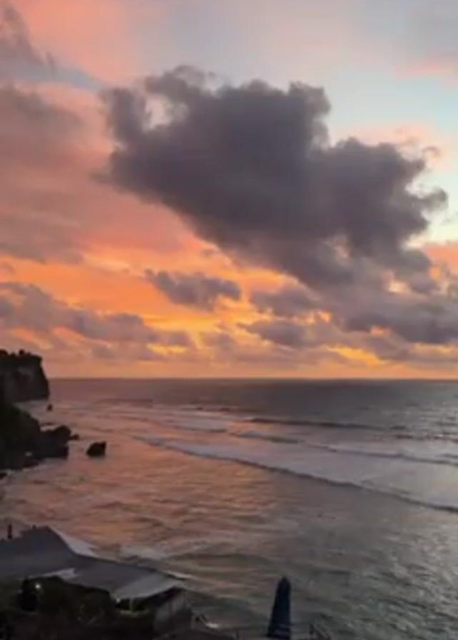 sunset over the ocean, with a view from a raised outdoor seating area. The sky is filled with clouds, colored pink, orange, and gray by the setting sun. The ocean is visible, with waves gently rolling towards the shore. A cliff face with some greenery is visible on the left side of the frame. Below the camera position, people are seated at tables with blue umbrellas on a patio. The lighting is muted due to the sunset.