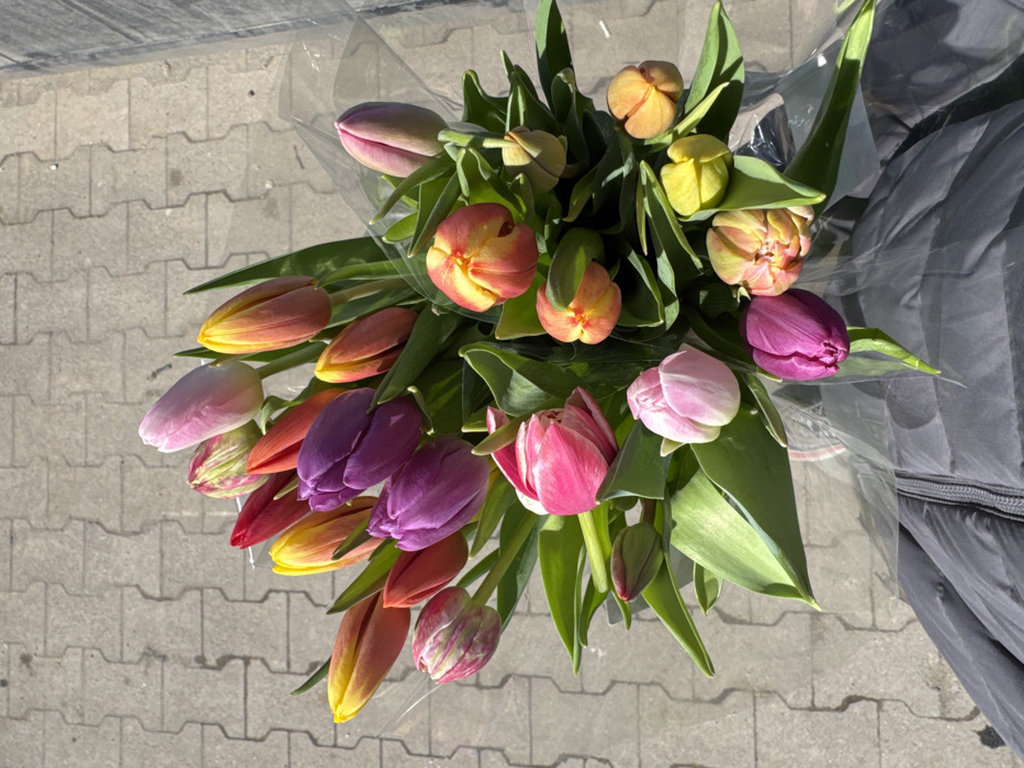 - "The image displays a vibrant bouquet of multicolored tulips held by an individual on a paved surface in Gorna Oryahovitsa, Bulgaria" by FM-0Qpf92, licensed under CC BY 4.0
