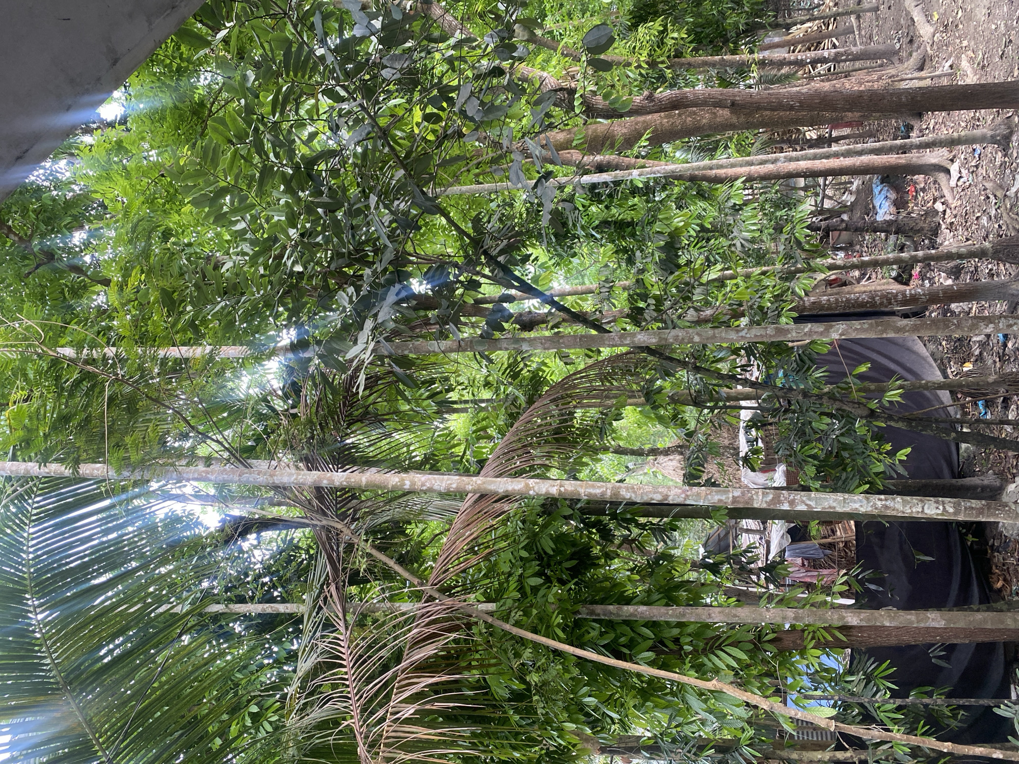 densely vegetated area, potentially in a rural or semi-rural part of Unknown, Bangladesh. Numerous trees with slender trunks are visible, interspersed with various types of foliage, including what appears to be a palm tree with both green and brown, dry fronds. The ground is covered with leaf litter and other debris. In the background, structures suggestive of makeshift dwellings or shelters are partially obscured by the trees. A dark, possibly tarpaulin-covered object is also visible amidst the vegetation. The overall impression is one of a natural environment with signs of human habitation and use.