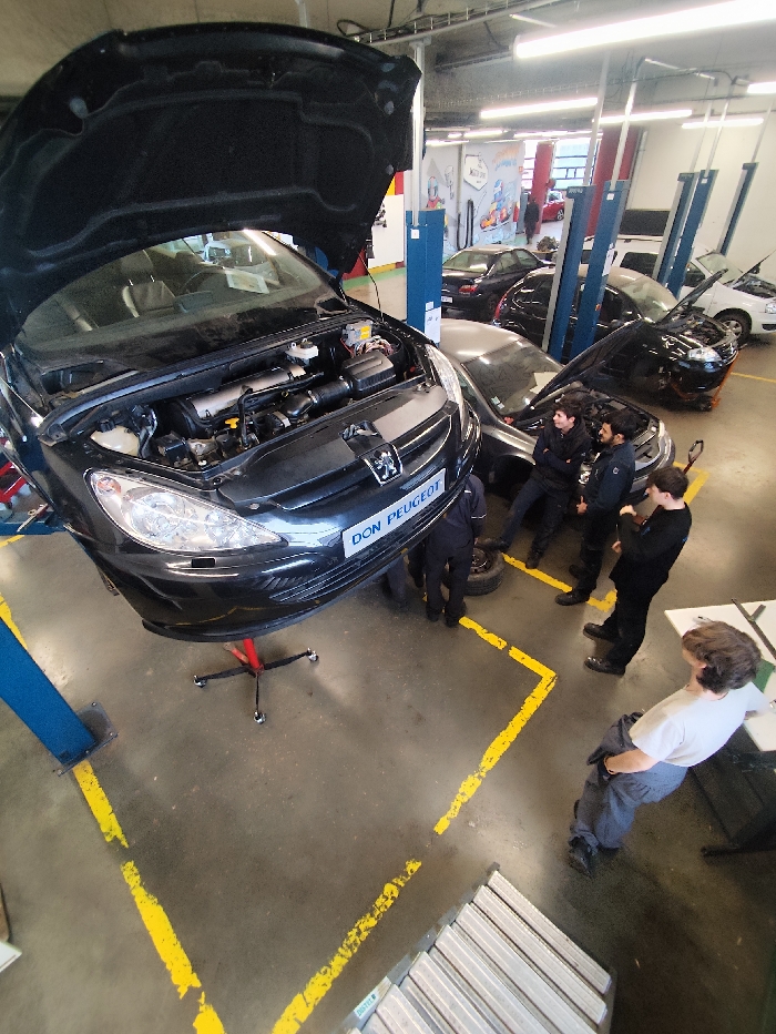The image depicts an indoor automotive workshop in an unspecified city and country. A black Peugeot vehicle, bearing "DON PEUGEOT" on its front bumper, is elevated on a blue hydraulic lift with its hood open, revealing the engine compartment. A red mobile stool is positioned beneath the front of the lifted vehicle. Four individuals, dressed in dark work uniforms, are situated near and under the lifted car; one is actively engaged below the vehicle, while three others observe and interact beside an adjacent dark sedan, also with an open hood. A fifth individual, wearing a light t-shirt and dark work pants, leans against a white table in the foreground right. The concrete floor is marked with yellow painted safety lines. Several other vehicles, predominantly dark sedans and a white car, are present in various stages of maintenance with their hoods open. The workshop is illuminated by overhead fluorescent fixtures. A wall mural depicting cartoon figures and an exterior view showing a red car are visible in the background.