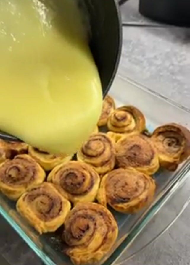 A thick, pale yellow sauce is being poured from a black saucepan onto a dish of baked cinnamon rolls