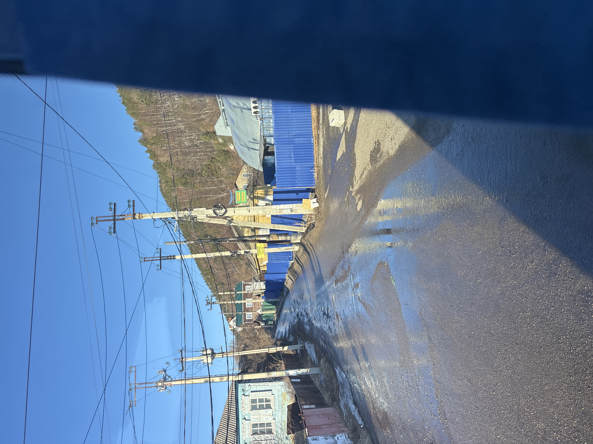 This image depicts a street scene in Listvyanka, Russia, under a clear blue sky. The view is partially obstructed on the right by a large, vertical blue surface. A wet, uneven asphalt road, showing patches of standing water and residual melting snow or ice, extends into the mid-ground, reflecting the sky and overhead power lines. On the left side of the road, a light blue wooden house with ornate white trim around its windows is visible behind a dark wooden fence. Multiple concrete utility poles, equipped with numerous cross-arms and an intricate network of overhead electrical and communication wires, line both sides of the street, receding into the distance. On the right side of the road, a vibrant blue corrugated metal fence runs parallel to the road, partially obscuring buildings behind it, including one with a dark green roof and another with a large, arched grey roof. A yellow sign with Cyrillic text, reading "ОБРАБОТКА УЧАСТКА" (Plot Processing), is affixed to a pole or post near this fence. A stack of light gray concrete blocks rests on the ground adjacent to the blue fence. In the background, a steep, forested hillside rises prominently, covered with a mix of evergreen and bare deciduous trees, suggesting an early spring or late autumn setting. The scene is illuminated by direct sunlight, casting shadows and reflections on the wet road surface. No individuals or specific actions are discernible within the frame.