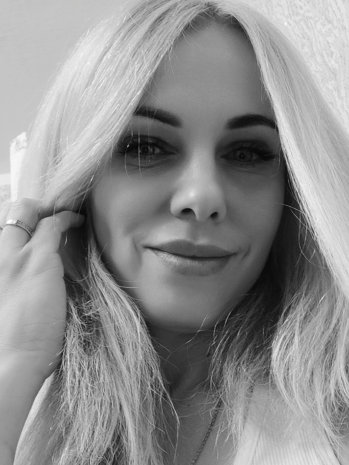 The image is a black and white, close-up portrait of an adult female. She possesses long, straight, light-toned hair that frames her face, parted slightly to her left. Her eyes are open and directed forward, featuring dark eyeliner and what appear to be long eyelashes. Her facial expression includes a slight, closed-lip smile. Her left hand is positioned near the left side of her face, with fingers lightly touching her hair near her ear. A patterned band-style ring is visible on her left ring finger. She wears a delicate chain necklace and a light-colored top, possibly ribbed. The background is an indistinct, light-toned, textured wall within an indoor environment. The specific location in the city of Sevastopol, Ukraine, is not discernible from the visual information presented in the image.