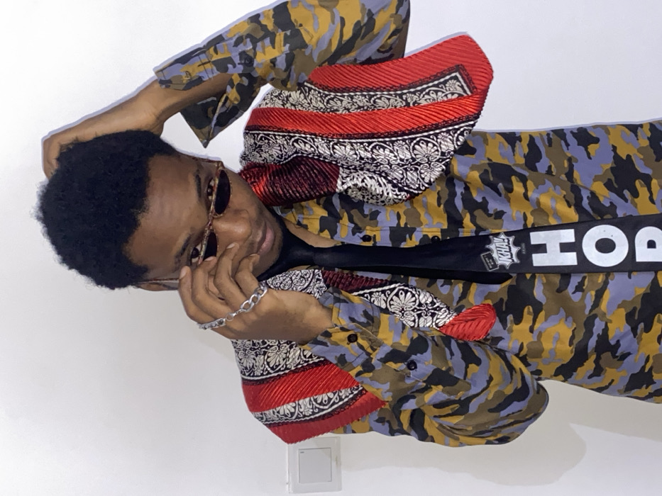 A stylish man poses in a camouflage-patterned shirt with unique red and white patterned details