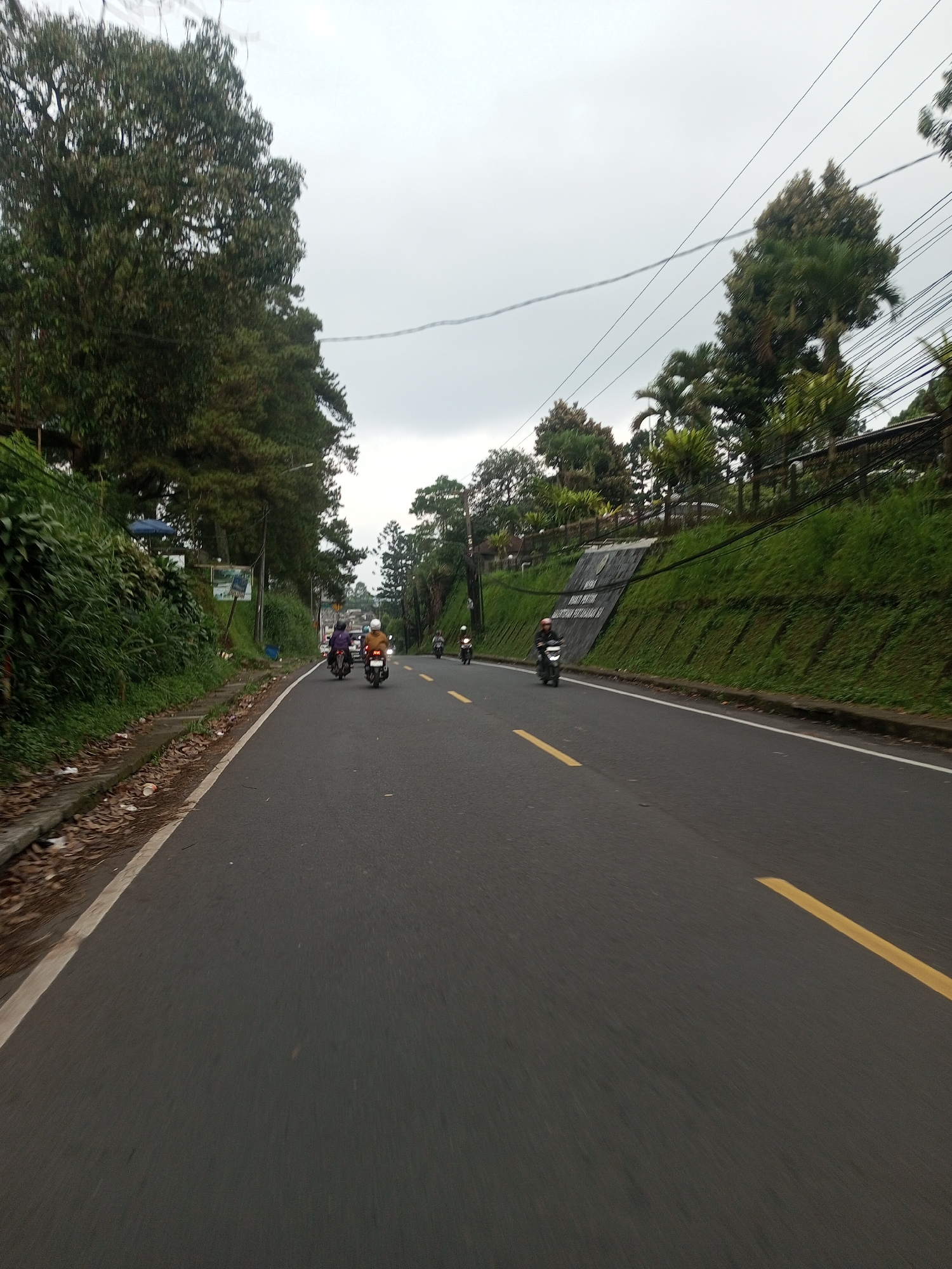 The image depicts a view from a moving vehicle on a paved road with a yellow dividing line. Several motorcycles are traveling in the same direction. The road is bordered on both sides by vegetation; trees and grassy areas are visible. A retaining wall is present on the right side of the road. Overhead, power lines stretch across the sky. The sky is overcast. The scene appears to be a road within a hilly or mountainous area, possibly near Taunggyi, Myanmar, given the context.