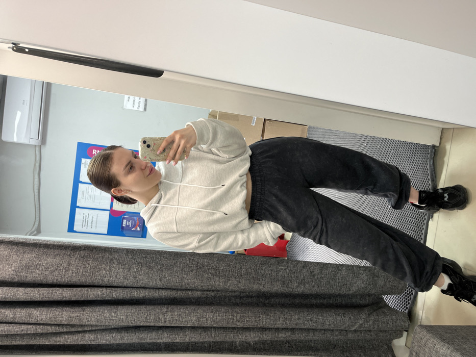 A female subject, with dark brown hair tied in a ponytail, stands angled slightly left, taking a mirror selfie with a mobile phone held in her right hand. She is wearing a light grey cropped hoodie, dark grey acid-wash sweatpants, and black chunky sneakers. Her left hand is in her pocket. The setting is an indoor space, likely a changing room or storage area within the city of Rostov-on-Don, Russia. To the left, a dark grey textured curtain hangs, with a matching upholstered stool visible in the lower left foreground. The floor is covered by a dark grey patterned mat. The background, reflected in the mirror, features a light blue wall. Mounted on this wall are a white air conditioning unit and a blue information board displaying several documents, one with a visible date of "01.11.2018". Below the board, a blue container with "RICH" text is present. Stacked cardboard boxes are visible in the background's lower right portion. A vertical white panel borders the scene on the far right. The area is illuminated by overhead artificial light.
