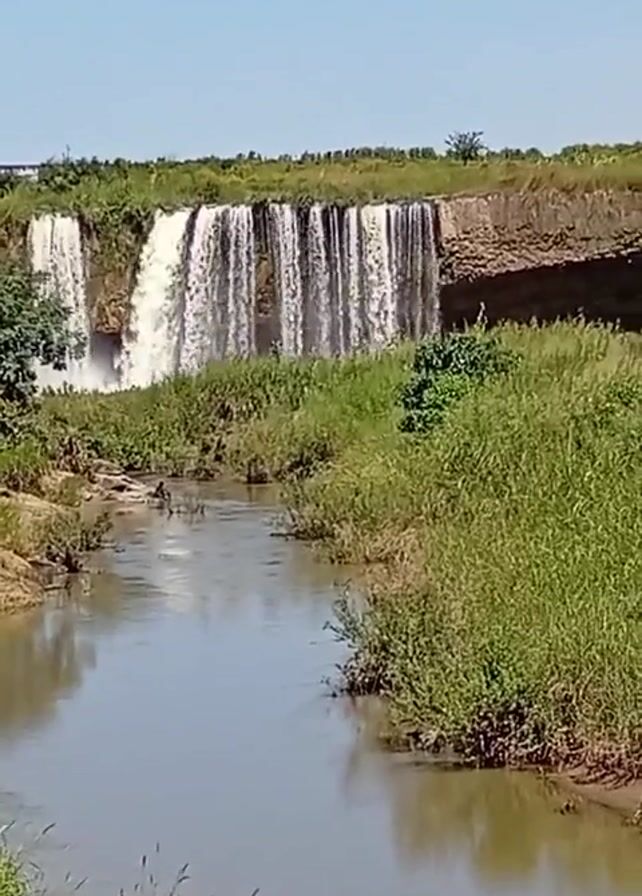 The video depicts a wide, shallow waterfall flowing into a narrow, slow-moving stream. Lush green vegetation lines the banks of the stream, contrasting with the clear blue sky. The waterfall itself is formed by water cascading over a flat, earthen ledge. The water appears frothy and white as it plunges down. In the distance, a structure that could be a bridge or a building is faintly visible on the horizon. There are no visible people or animals in the scene.