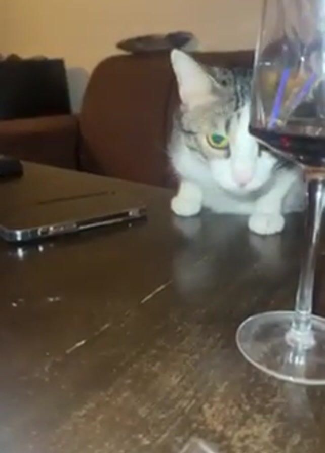 A medium shot depicts a small tabby and white cat sitting on a dark wooden table next to a partially full wine glass