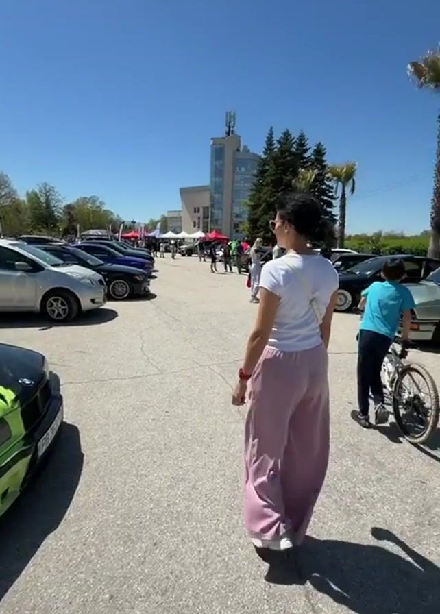 car show in a parking lot on a sunny day. Several BMWs are on display, including a bright green one with black claw marks on the hood, a silver four-door, and a dark gray convertible with Italian flag stripes on the side. People are walking around looking at the cars, and a boy rides his bike through the scene. There are trees and a building in the background, and the sky is clear and blue.