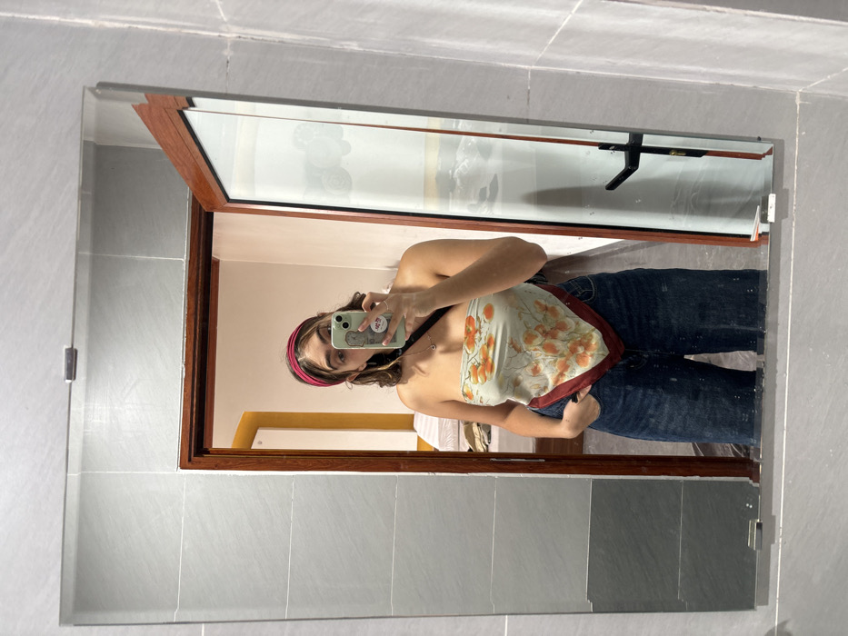 - "A woman with shoulder-length wavy brown hair, wearing a pink headband, poses for a mirror selfie" by FM-bmo3E3, licensed under CC BY 4.0