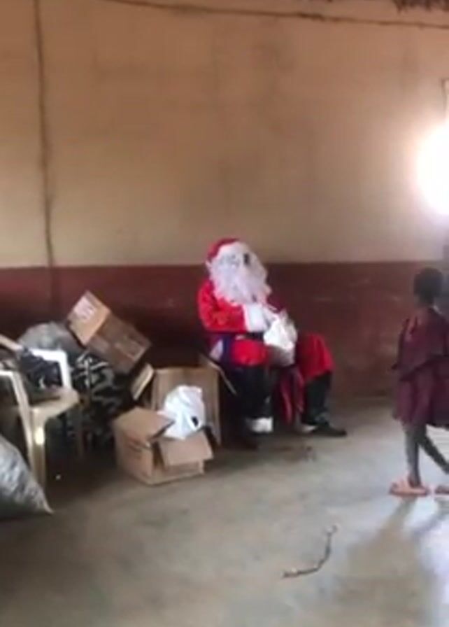 Santa Claus, wearing a full red and white suit with a large white beard, is seated in a chair in a room, handing out white gift bags to children. The room has rough walls with a red stripe along the top and a simple wooden beam ceiling. There are cardboard boxes stacked around Santa, and a few plastic chairs are nearby. The floor is plain concrete. Children of various ages approach Santa, receive a gift bag, and then walk away. Other people, including adults, can be seen in the background, presumably parents or guardians. The lighting is uneven, with a bright patch of light coming from a window.