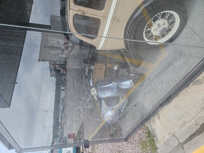 The image presents a view through a large, somewhat smudged glass display case, blending interior and exterior elements. Inside the case, positioned on a concrete floor with yellow parking lines, is a silver-colored Vespa-style scooter on its kickstand, facing left. To its right, the rear section of a tan vintage sedan is visible, featuring a white pinstripe along its side and a prominent white spoked wheel with a dark tire. Reflected and visible through the glass is an expansive industrial or commercial lot in Tudela, Spain, under an overcast sky. In the distant background, several large wind turbines stand atop a tree-lined ridge. Closer to the foreground, multiple large grey industrial buildings and various parked commercial vehicles, including a red truck, are present. The ground outside consists of asphalt, gravel, and patches of grass. No individuals are visible.