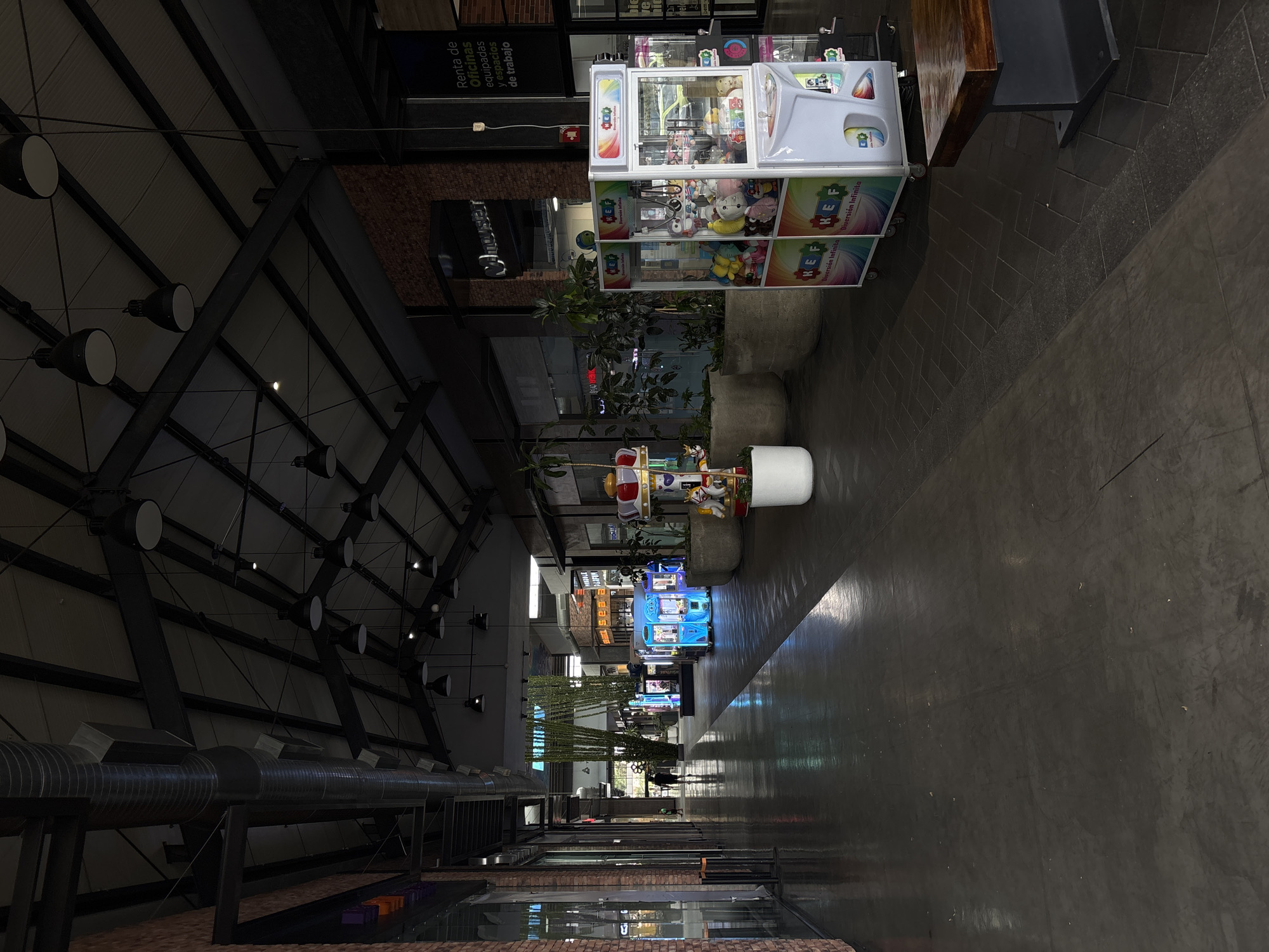 Here's a detailed description of the image: **General Scene:** The image shows a long, narrow, interior space that appears to be a commercial or entertainment area. The perspective is linear, giving a sense of depth to the scene. **Architectural Elements:** * **Ceiling:** High ceiling with a visible network of dark metal support beams. There are rows of what appear to be spherical light fixtures hanging from the ceiling structure. * **Flooring:** Dark, possibly concrete or stone flooring that extends throughout the area. * **Walls:** The walls are made of brick. **Objects and Subjects:** * **Arcade Games:** Several arcade-style game machines are visible along the path. These include claw machines filled with stuffed animals, and other various games. * **Plants:** There are plants in large planters, located along the edge of the path. * **Signage:** A sign on the side of a building. **Location:** The sign says, "Renta de Oficinas equipadas y espacios de trabajo". This indicates the location is in Mexico. Additionally, "Kef Diversion Infinita" is printed on the arcade game, indicating the location is San Pedro Cholula, Mexico. **Atmosphere:** The image has a somewhat dim or low-light ambiance.