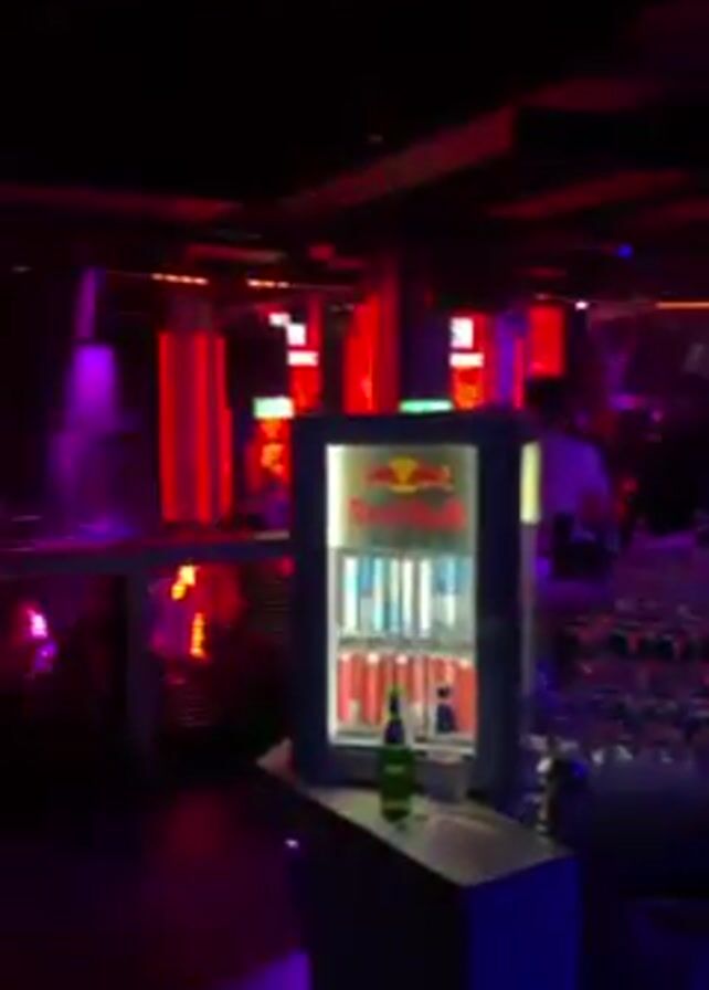 inside of a nightclub. The lighting is dark, with red, blue, and purple lights flashing. There is a bar in the foreground with several glasses and a Red Bull refrigerator filled with cans. There are a few people visible in the background, but they are out of focus. Electronic music plays in the background.