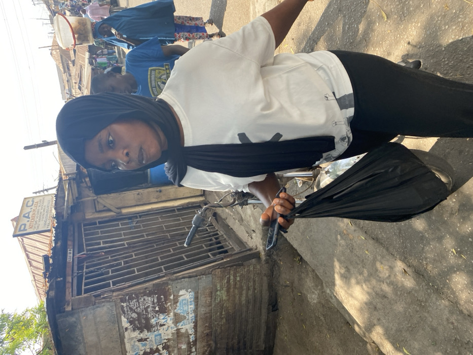 The image captures a daytime street scene in Lokoja, Nigeria, specifically near the Old Market, as indicated by a sign for "P.A.C. Kitchen Plaza." The primary subject, a woman, is positioned slightly right of center, walking forward with her head turned slightly to her left. She wears a black hijab, a white short-sleeved t-shirt with a subtle graphic design, and black trousers. In her right hand, she carries a black smartphone and a black plastic bag. To the left of the main subject, a portion of a bicycle, including its handlebars and front wheel, is visible. Behind her, a single-story building with a dilapidated appearance stands, constructed from corrugated metal sheets and wood. Its entrance is secured by a metal gate, and its wooden facade is covered with multiple torn advertisements and posters, one partially displaying the phone number "081 557 88 022." Above this structure, a sign reads "P.A.C. KITCHEN PLAZA," specifying "ALL KINDS OF KITCHEN UTENSILS, WHOLESALERS & RETAILS, LOCATED AT OLD MARKET, LOKOJA." In the mid-ground, behind the main subject, another woman wearing a blue t-shirt is partially visible. Further back and to the right, a person dressed in a blue garment is seen carrying a white plastic bucket on their head. The street surface is uneven, consisting of a mix of concrete and dirt, extending uphill into the background where other indistinct figures are present. Bright daylight illuminates the scene, casting distinct shadows.
