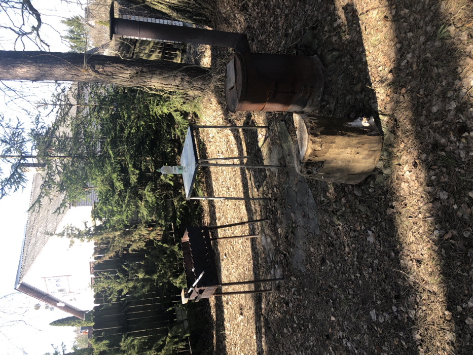 The scene, located in Гожскі сельскі Савет, Belarus, depicts an outdoor area characterized by exposed earth covered in dry leaves and pine needles, illuminated by strong daylight creating distinct shadows. In the foreground-left, a dark, rectangular metal barbecue grill (mangal) stands on four legs, with a metal skewer or similar tool resting across its top. Adjacent to it, in the center, is a square, light-colored metal table holding an upright transparent plastic water bottle. To the right, a weathered tree stump sits on the ground near a rusty, cylindrical metal barrel, which appears to be a makeshift stove or incinerator, topped with a vertical metal exhaust pipe. A large, mature tree trunk stands immediately behind the barrel. The background features a dark wooden fence partially obscured by dense green coniferous trees. Beyond the fence and trees, a white-walled house with a dark, sloped roof is visible. No individuals are present, and no actions are actively occurring.