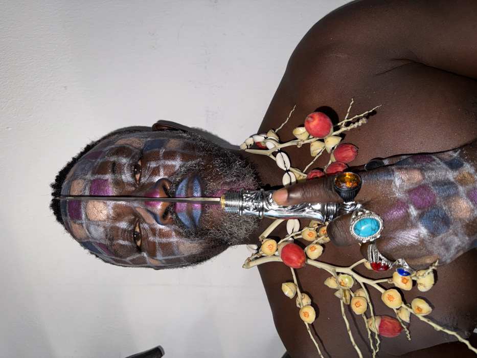 An adult male is depicted in a close-up portrait, taken in Ado, Nigeria, against a uniform, light-colored wall. The subject's face and visible right hand are covered in a grid pattern of multi-colored iridescent paint, featuring shades of silver, gold, bronze, purple, and blue. Blue pigment is applied to his lips, and a pink streak extends from his philtrum. His facial hair is a greying beard. A slender, metallic object, resembling a ceremonial knife with an ornate silver-colored hilt, is held vertically by his right hand, obscuring a portion of his nose and mouth. His right index finger rests on the hilt. Multiple rings are present on his right hand, including one with an amber-colored stone on the index finger and one with a turquoise-colored stone on the middle finger. Bare-chested, the subject wears a necklace of white cowrie shells, adorned with intertwined branches bearing yellow spherical fruits and larger red oval fruits. A dark, indistinct object is partially visible in the upper left background.