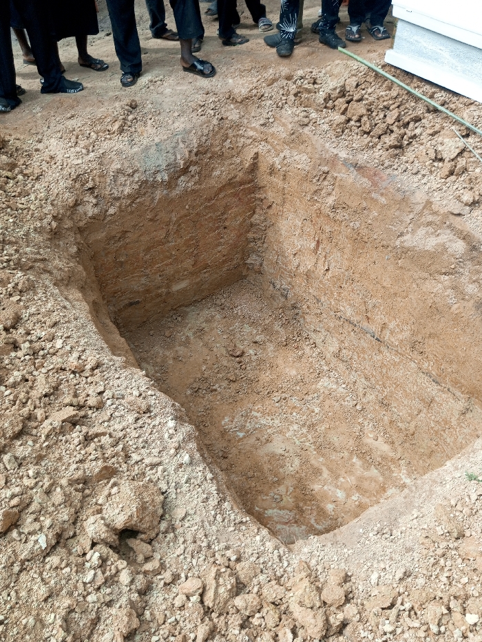 A rectangular, hand-excavated pit, approximately 1.5 to 2 meters deep, is observed in an unpaved outdoor area in the city of Unknown, Unknown. The pit exhibits vertical earthen walls composed of light brown soil and a flat bottom. Piles of loose, light brown soil and earth surround the excavation's perimeter. The lower legs and feet of at least six individuals are visible in the upper portion of the frame, standing around the edge of the pit. They are attired in dark trousers or robes and a variety of footwear, including sandals and closed shoes. A light green flexible hose runs diagonally across a pile of excavated earth in the upper right quadrant. Stacked white, rectangular objects are partially visible in the far upper right. No direct actions or interactions are discernible beyond the individuals' presence around the excavation.