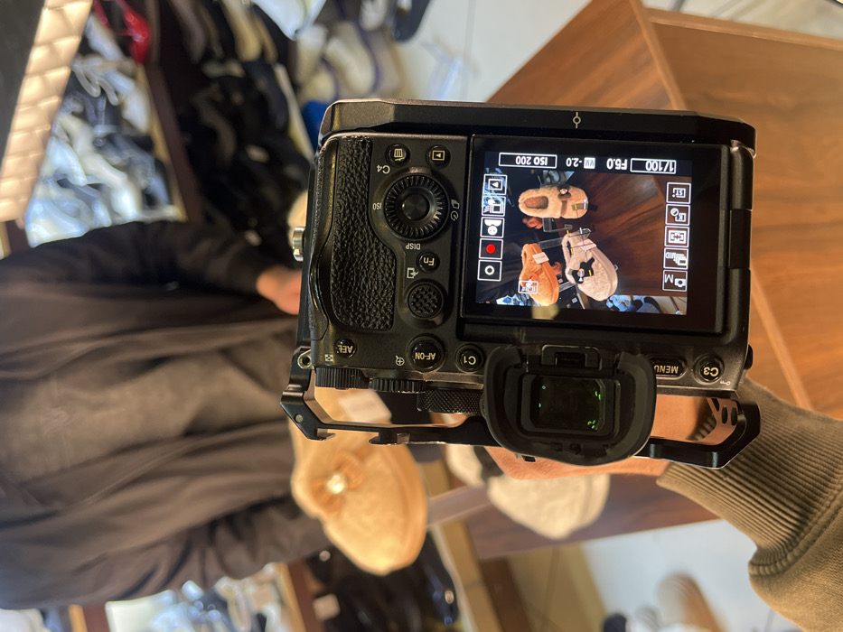 A Sony Alpha series mirrorless camera is held in the foreground, capturing a product display within a retail establishment located in Al-Midan Municipality, Syria