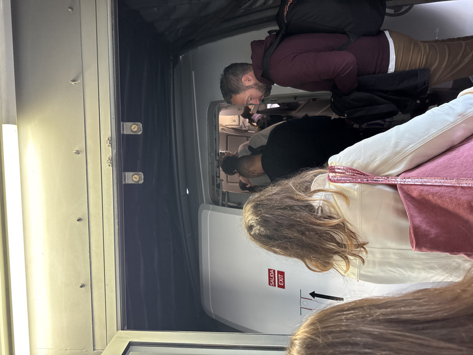 The scene depicts passengers boarding an aircraft at El Prat de Llobregat Airport in Spain. Multiple individuals are visible within what appears to be a jet bridge or air stairs leading into an airplane. In the immediate foreground on the left, a portion of a person with long brown hair is visible. Centrally, a female individual, seen from the back, has long, wavy brown hair and wears a light-colored, possibly off-white, jacket. She carries a large pink fabric tote bag with shiny pink straps on her right shoulder. To her right, a male individual with a beard, seen in profile, wears a maroon hooded sweatshirt over a white shirt and light brown trousers. He carries a black backpack on his left shoulder and holds a dark jacket in his left hand. Directly in front of these individuals is the open door of an aircraft. The interior of the aircraft cabin is visible, with several passengers queuing and moving further inside. The aircraft door itself is white and features a red sign with "SALIDA" above "EXIT", and a black upward-pointing arrow beneath it. The surrounding structure of the boarding area consists of light grey walls with an overhead fluorescent light fixture. The entrance to the aircraft from the boarding area is framed by dark, possibly black, fabric-like material.