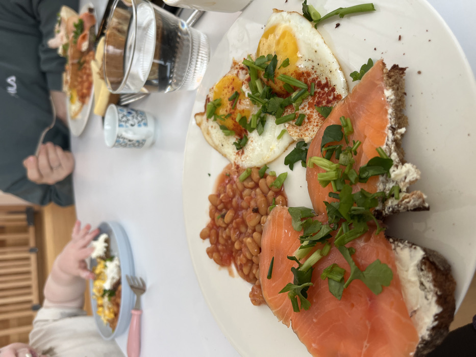 The image displays a mealtime scene at a white table within an indoor domestic setting in Gangloff, Germany. In the foreground, a white, round plate contains a portion of baked beans in sauce, two fried eggs garnished with paprika and chopped green herbs (likely chives or parsley), and two slices of dark bread spread with a white creamy substance, topped with slices of smoked salmon and green herbs. One of the bread slices exhibits a bite mark. In the midground, another person, visible from the chest up and wearing a green sweatshirt with "FILA" branding, holds a fork over a white plate which also appears to contain breakfast items, including what resembles baked beans and possibly other elements. To the left, a child's hands are seen reaching towards a light blue plate holding scrambled eggs or similar food. On the white table, near the adult, a clear glass filled with water and a small, white cup with blue decorative patterns are present. The background features a blurred wooden structure, possibly a safety gate or barrier. The overall lighting suggests a brightly lit interior.