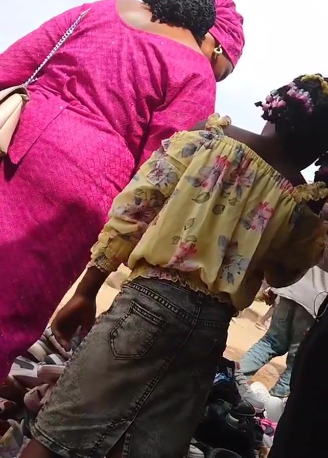 woman in a bright pink dress and head wrap standing next to a young girl in a yellow floral top and gray denim skirt. They are both looking at a pile of shoes, which appear to be laid out for sale. A man in black pants stands near the girl, possibly interacting with the shoe selection. The scene appears to be at an outdoor market or roadside sale. A bicycle passes in the background.