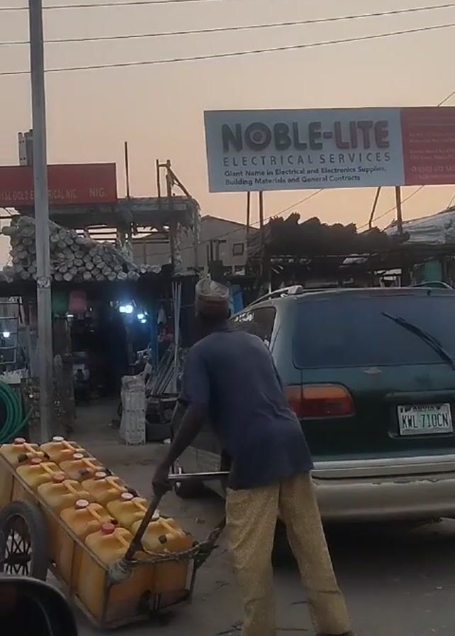 The video depicts an outdoor scene, likely a street in Nigeria, with a man pulling a cart loaded with yellow jerrycans