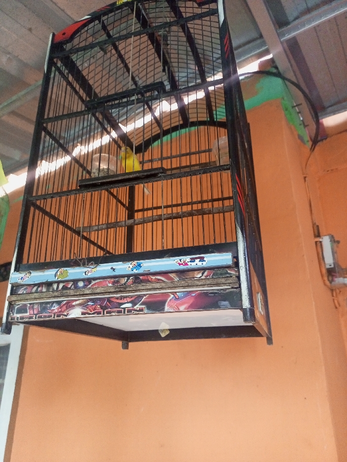 A rectangular birdcage, dark in color with black framing and vertical bars, hangs suspended in an outdoor or semi-outdoor area in Ciherang, Indonesia. Inside the cage, a single canary-yellow bird is perched on a wooden dowel, positioned near a transparent plastic feeder containing seeds. The lower portion of the cage is decorated with a panel featuring "IRON MAN" text and an image of the character, topped by a light blue strip adorned with small cartoon figures. The background consists of an orange-painted wall. Above, a metal roof structure with corrugated sheets and trusses is visible, with a section of the wall painted light green where it meets the roofline. An electrical component is mounted on the orange wall to the right of the cage. Natural light illuminates the scene from above.