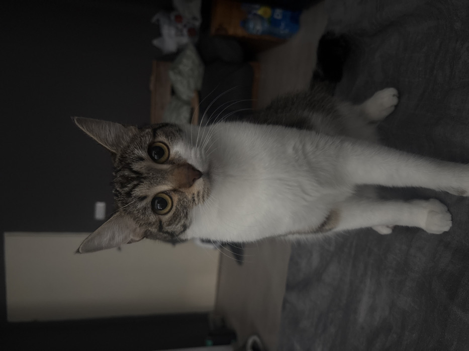 A domestic short-haired cat is positioned centrally in an indoor setting located in Radomir, Bulgaria. The cat features a tabby and white coat pattern, with distinctive brown and grey stripes on its head and back, contrasting with a white muzzle, chest, belly, and front paws. Its eyes are large, round, and amber-colored with dilated pupils, directed forward towards the observer. Prominent white whiskers extend from its muzzle. The cat sits upright on a grey textured blanket or fabric. In the background to the left, a light-colored door or tall cabinet is partially visible against a dark wall. To the right, a dark wall continues, with indistinct shapes of furniture, including what appears to be a wooden crate and several plastic bags, along with a blue plastic bottle, subtly visible in the dimly lit background. The overall scene suggests a static portrait of the animal within a residential interior.