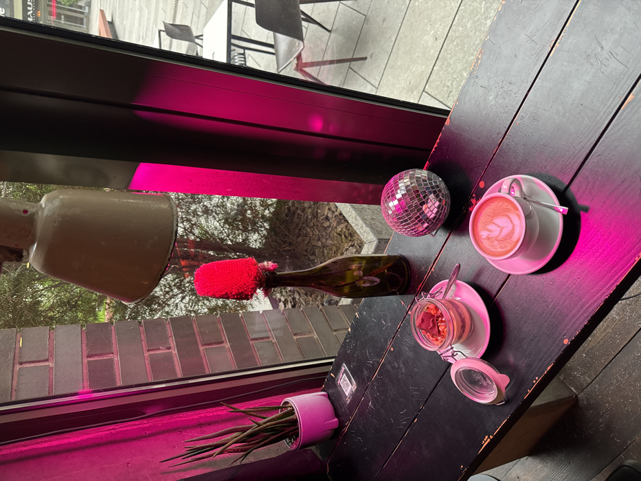 The image captures an indoor cafe setting, viewed from a slightly elevated perspective looking down onto a distressed black wooden table and through a window to an outdoor urban area. A prominent magenta/pink light illuminates the interior space. On the black wooden tabletop, from left to right: a white cylindrical pot holds a green snake plant; a small square QR code sticker is affixed to the surface; a dark green bottle, likely for wine or champagne, is topped with a bright red, fuzzy, conical stopper or decorative element; a small, silver mirrored disco ball rests beside it; a clear glass jar with a hinged metal clasp lid contains a layered dessert (parfait or tiramisu-like) garnished with red toppings, presented on a white saucer with a spoon, the lid open and positioned to the side; and a white ceramic coffee cup with white latte art (a leaf design) sits on a white saucer with a silver spoon. Above the table, near the window frame, a gray, industrial-style metal lamp shade hangs. Beyond the window, an outdoor paved patio or sidewalk is visible, featuring a white square table and several dark gray chairs for outdoor seating. Green foliage is discernible, and in the background, part of a building displays a red sign with white lettering clearly spelling "HAUS". This specific signage, coupled with the contemporary cafe aesthetic, locates the scene in Dnipro, Ukraine, likely within or adjacent to a cafe or business named "HAUS". No individuals are present in the image.