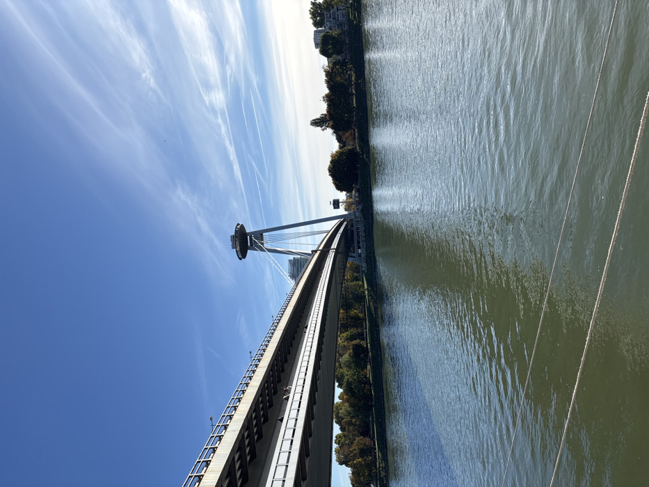 - "The image depicts the Most SNP (UFO Bridge) over the Danube River in Bratislava, Slovakia, under a bright blue sky with scattered cirrus clouds and multiple aircraft contrails" by FM-dNm8j2, licensed under CC BY 4.0