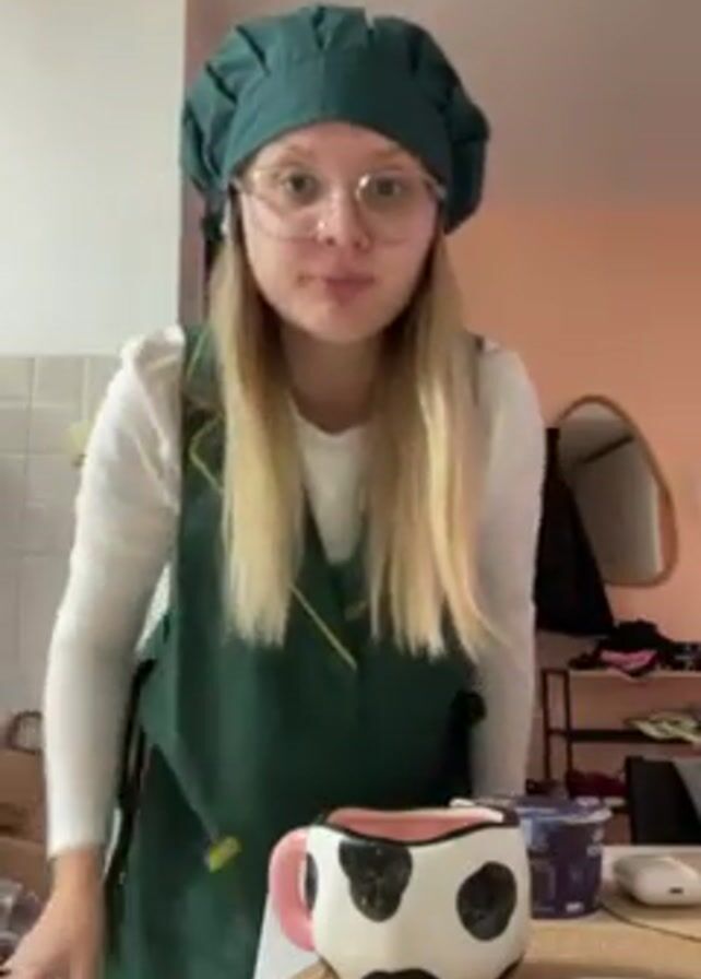 A young woman with blonde hair and glasses is standing in what appears to be a kitchen. She is wearing a white long-sleeved shirt, a green apron, and a green chef's hat. The apron has yellow trim. In front of her, on a table, there's a cow-print mug and a matching saucer with a spoon. Behind her, there's a mirror and a partially visible room with various items. The woman is talking to the camera, and at one point, she puts her hands on her hips and turns slightly to the side. She seems to be showing off her costume.