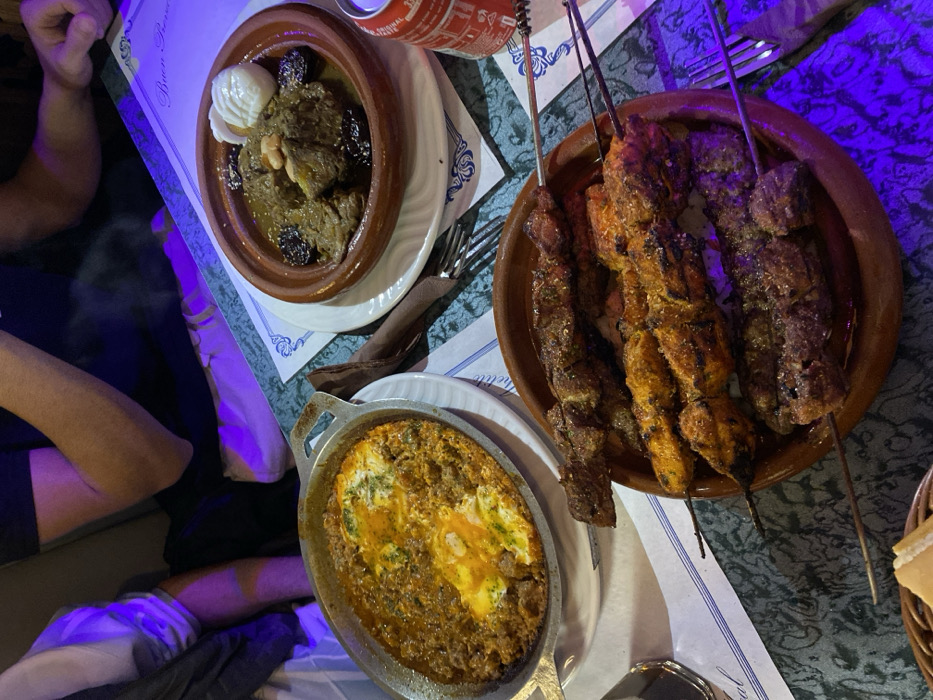 The photo presents a table with three dishes. A tagine, served in a traditional earthenware pot, contains meat with plums and what appears to be an egg or yogurt dollop on top. Another dish features skewers of grilled meat, showcasing varied colors and textures. A third dish, in a silver pan, seems to be a baked egg-based dish with a meat or vegetable filling. The table setting includes blue patterned placemats, cutlery, and what appears to be a can of soda.