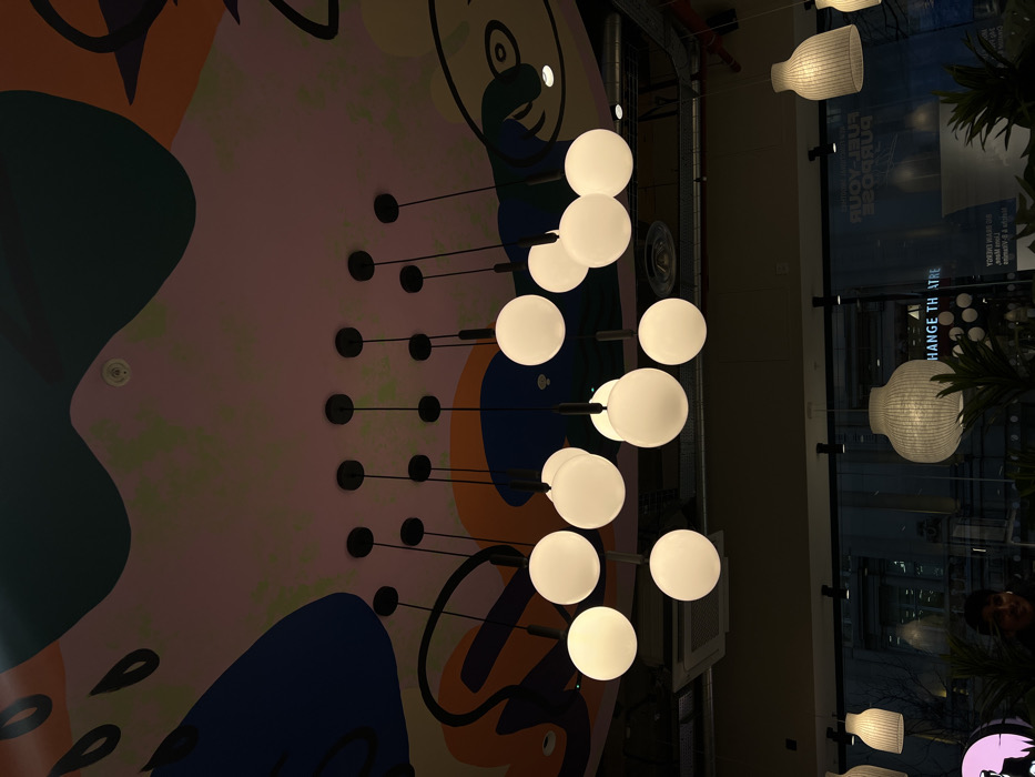 - "Several clusters of spherical lights hang from a patterned ceiling" by FM-tW5MS2, licensed under CC BY 4.0