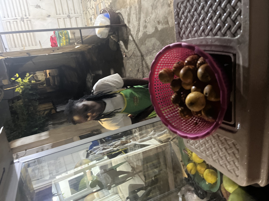 A woman stands beside a glass display case filled with produce, with a basket of round fruits, possibly plums, placed on top of a white cooler. A white building with a balcony is in the background. Some green plants and fruits are in front of the case. The image is slightly rotated, and the lighting suggests it's evening.