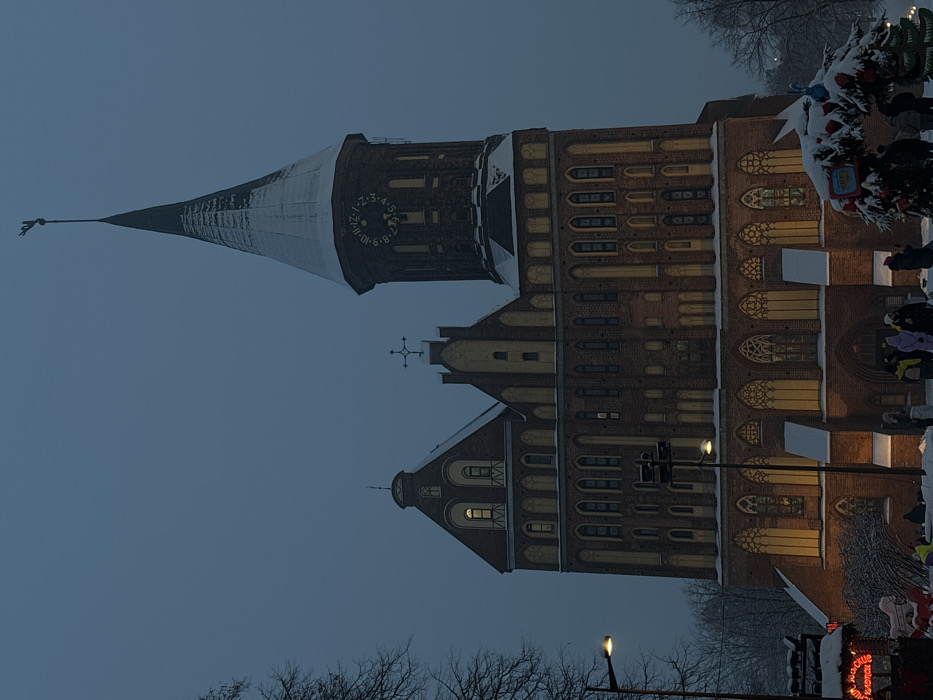 A tall, brick cathedral dominates the image against a dim, overcast sky. Its pointed spire is partially covered in snow, with a clock face visible below. The cathedral features multiple levels with arched windows and intricate architectural details. Light emanates from some windows. In the foreground are bare tree branches and blurred figures, suggesting a winter scene. A Christmas tree stands to the right.