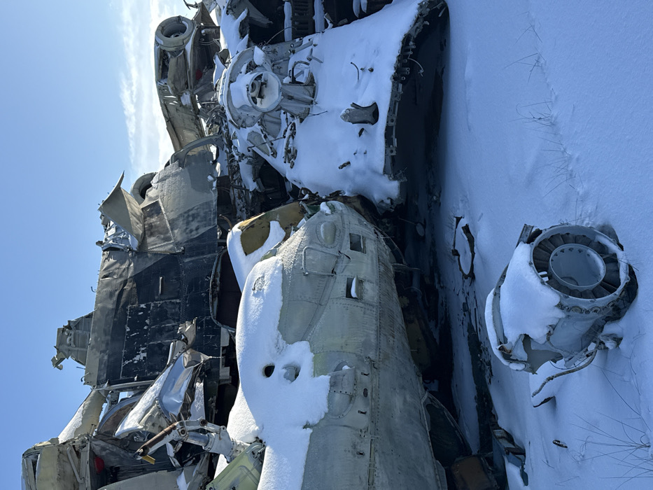 - "The image displays an outdoor scene in the city of Unknown, Ukraine, featuring a significant accumulation of dismantled or destroyed aircraft components under a layer of snow" by FM-HJIgS2, licensed under CC BY 4.0
