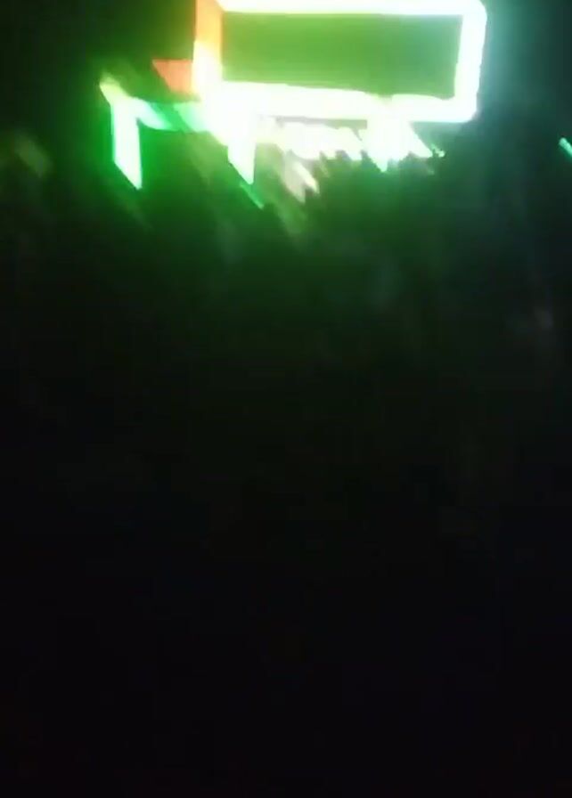 dark outdoor environment at night, with a crowd of people in front of a structure illuminated by green and blue neon lights. There is music playing. People seem to be dancing. The camera moves slightly, focusing at one point on people standing near a booth with a sign that says "Point & Kill" and "Available Soon."