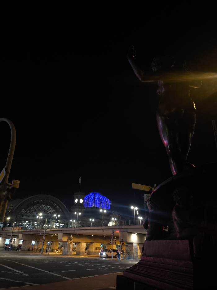 The image depicts a nighttime urban scene in Dresden, Germany, specifically facing the Dresden Hauptbahnhof (main train station). In the immediate foreground, to the right, a large, dark statue, partially silhouetted and appearing to be a classical figure (likely part of the Siegesdenkmal, or Victory Monument, located outside the station), is illuminated by an unseen light source creating lens flares. The statue's base is visible. In the mid-ground, the main structure of the Dresden Hauptbahnhof is prominent. Its distinctive arched glass and steel roof is illuminated from within, revealing the intricate structure. To the right of this main hall, a clock tower with a prominent clock face is visible. The dome atop this clock tower is brightly illuminated in a vibrant blue color. A multi-lane street with visible road markings and traffic lights occupies the lower portion of the frame. Several streetlights illuminate the area. A concrete bridge, supporting the train tracks, crosses above the street, with multiple archways underneath. Sparse activity is visible: a few pedestrians walk on the sidewalks near the station entrance and under the bridge, and several vehicles, including at least two cars with illuminated headlights, are present on the street. The sky above is completely dark, indicating nighttime.