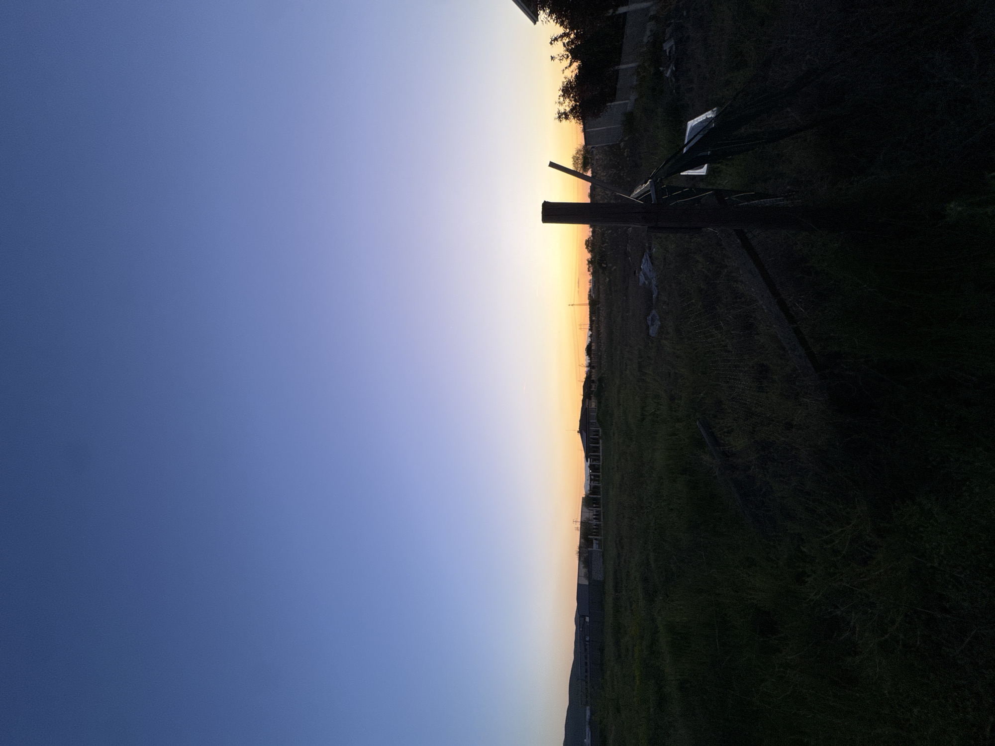 The image depicts a twilight scene in Plovdiv, Bulgaria. The sky transitions from a deep blue on the left to a lighter blue-orange hue near the horizon. On the right side of the frame, a grassy field slopes upward into a darker area of vegetation, bordering what appears to be a residential area. A dilapidated wooden fence runs along the edge of the field. In the distance, a line of buildings and utility poles can be seen silhouetted against the setting sun. There are no people visible in the image.