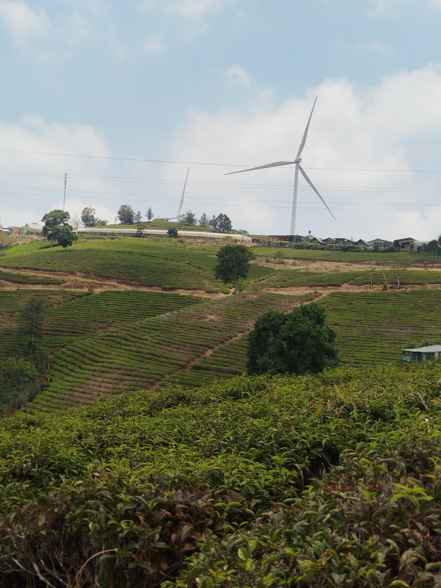 hilly landscape in Trường Thọ, Vietnam. In the foreground is dense, low-lying vegetation. Above this, terraced tea plantations cover the hillside. Scattered trees grow among the terraces. On the hilltop, several buildings and two wind turbines are visible against a cloudy sky. Overhead power lines stretch across the scene.