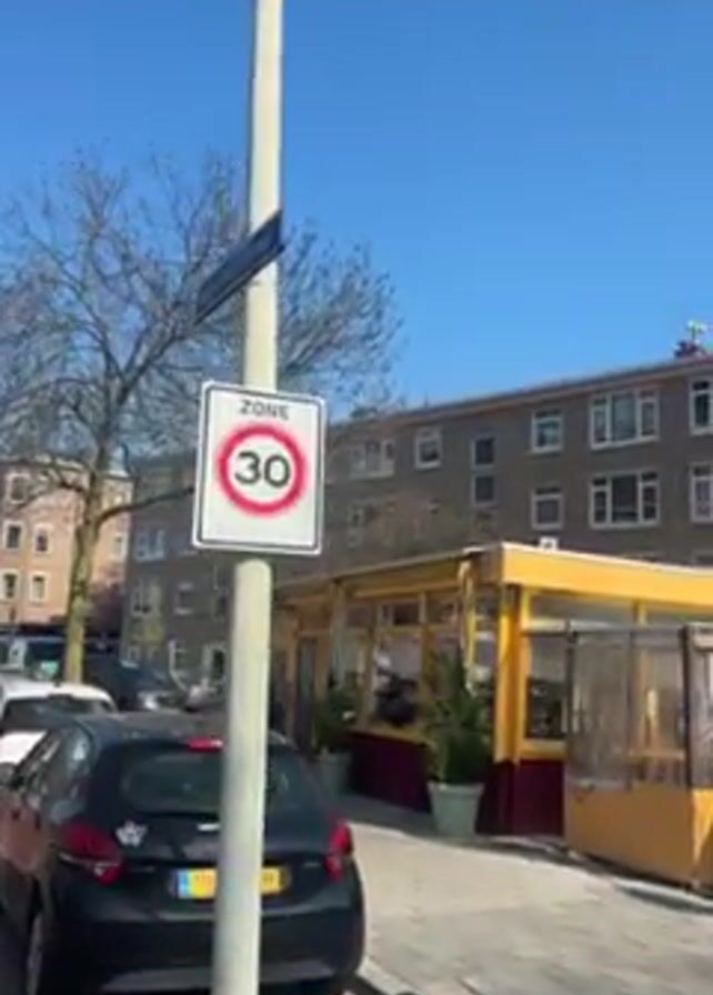 street in what appears to be a European city. The camera starts by focusing on a street sign indicating a "Zone 30" speed limit. A yellow-walled business with outdoor seating is visible in the background. The camera then pans to the left, revealing a red-brick bike lane alongside a road with parked cars and multi-story apartment buildings on either side. A few bare trees are scattered along the street. The sky is clear and blue. A pigeon walks across the bare soil between the bike lane and the parked cars.