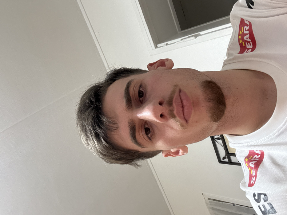 This image presents a close-up, frontal portrait of a young adult male, captured indoors within a residential or private setting in Strasbourg, France. The subject has short, dark brown hair and light brown eyes, a light complexion, and exhibits a goatee connected to a mustache. His lips are slightly parted. He is wearing a white short-sleeved garment, identifiable as a t-shirt or sports jersey, which features a prominent red "SEARA" logo on the right shoulder area and partially visible black lettering, beginning with "ES", on the left shoulder. The background consists of a light-colored wall and a matching ceiling, where a diagonal seam is visible. A sheer white curtain is partially visible on the left side of the frame. Behind the subject's left shoulder, a dark-framed decorative object with scrollwork details is present. To the right of the subject, a white door frame indicates an open doorway leading to an adjacent room with light-colored walls.