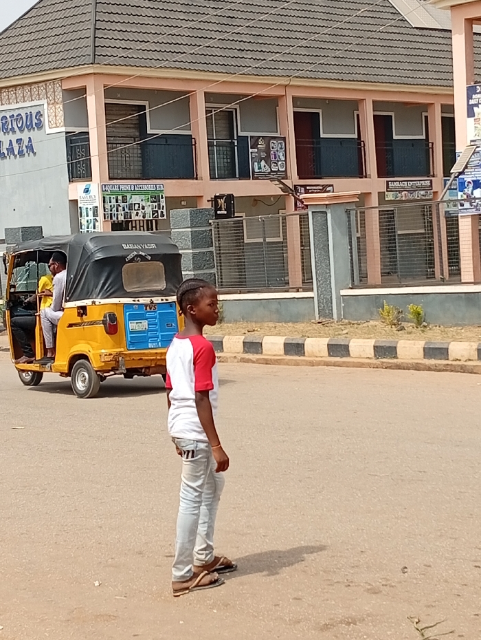 The scene is set on an asphalt road in Sabon Gari Nassarawa, Nigeria, under clear daytime conditions