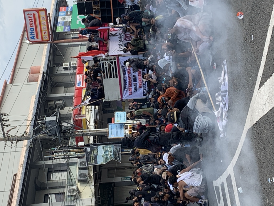 The image depicts an urban street scene in Pati, Indonesia, characterized by a dense gathering of individuals. A large crowd, predominantly male, occupies the paved road surface. Many are seated directly on the asphalt, while others stand. In the foreground, white smoke emanates from an object on the road, where a person is using a stick to interact with it; a discarded orange-and-white can lies nearby. In the midground, a significant number of people are seated or standing in close proximity. One individual in a full black hooded outfit stands prominently in this section, arms crossed. In the background, atop a light-colored flatbed truck or platform, another group of people is visible, several holding or displaying red and white Indonesian flags. Two large banners are affixed to this structure: one on the left displaying Indonesian text translating to "Submissive to oppression or rise up to fight because silence is betrayal of the community...", and another on the right partially visible with the text "KELOMPOK P...". Commercial buildings line the background, featuring multiple "Alfamart" signs, air conditioning units, and a poster for "GOLDENWALUH PARK RESIDENCE" explicitly mentioning "Pati". A complex utility pole with numerous power lines and a transformer dominates the midground skyline. The scene is illuminated by diffuse daylight.