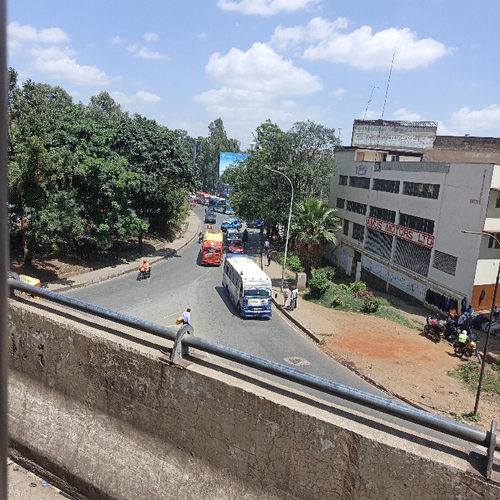 This image provides an elevated view of a bustling urban street in Nairobi, Kenya, under a bright, partly cloudy sky