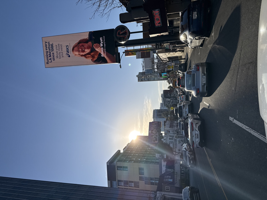 The image depicts an eastbound street scene on Sunset Boulevard in West Hollywood, Los Angeles County, California, United States, during daytime under a clear blue sky. The sun is low in the sky, positioned to the left of center, causing a significant lens flare and casting long shadows from vehicles and structures towards the right side of the frame. The street is a multi-lane thoroughfare experiencing heavy traffic, with numerous vehicles stopped or moving slowly. In the foreground, from the perspective of a vehicle, a white BMW convertible is visible in the left-center lane, followed closely by a silver Porsche 911 in the adjacent right lane. Further right, a dark grey Tesla sedan occupies the rightmost lane. A diverse range of other passenger vehicles, including sedans and SUVs, extends into the distance. On the left (north) side of Sunset Boulevard, tall, modern multi-story buildings with glass and light-colored facades are visible. A lower building features signage for "TENMASA" (Japanese restaurant). Further down the street, additional commercial buildings line the road. On the right (south) side of Sunset Boulevard, a large vertical billboard prominently displays an advertisement for Asics. The billboard features a smiling woman identified as Aimee Wyatt, an "LA Marathon Legacy Runner," with text stating, "Running every LA Marathon since 1986. Move your body, move your mind." Below the billboard, a circular red sign with a crossed-out 'P' (indicating a parking restriction) is affixed to a pole. Adjacent to this, a building with a visible "ROXY" sign (red neon/LED letters) identifies The Roxy Theatre. Bare tree branches are visible against the sky near the Roxy. Additional commercial establishments, including one marked "Bar & Grill," extend down the street. Overhead utility lines and streetlights are visible on both sides of the road.