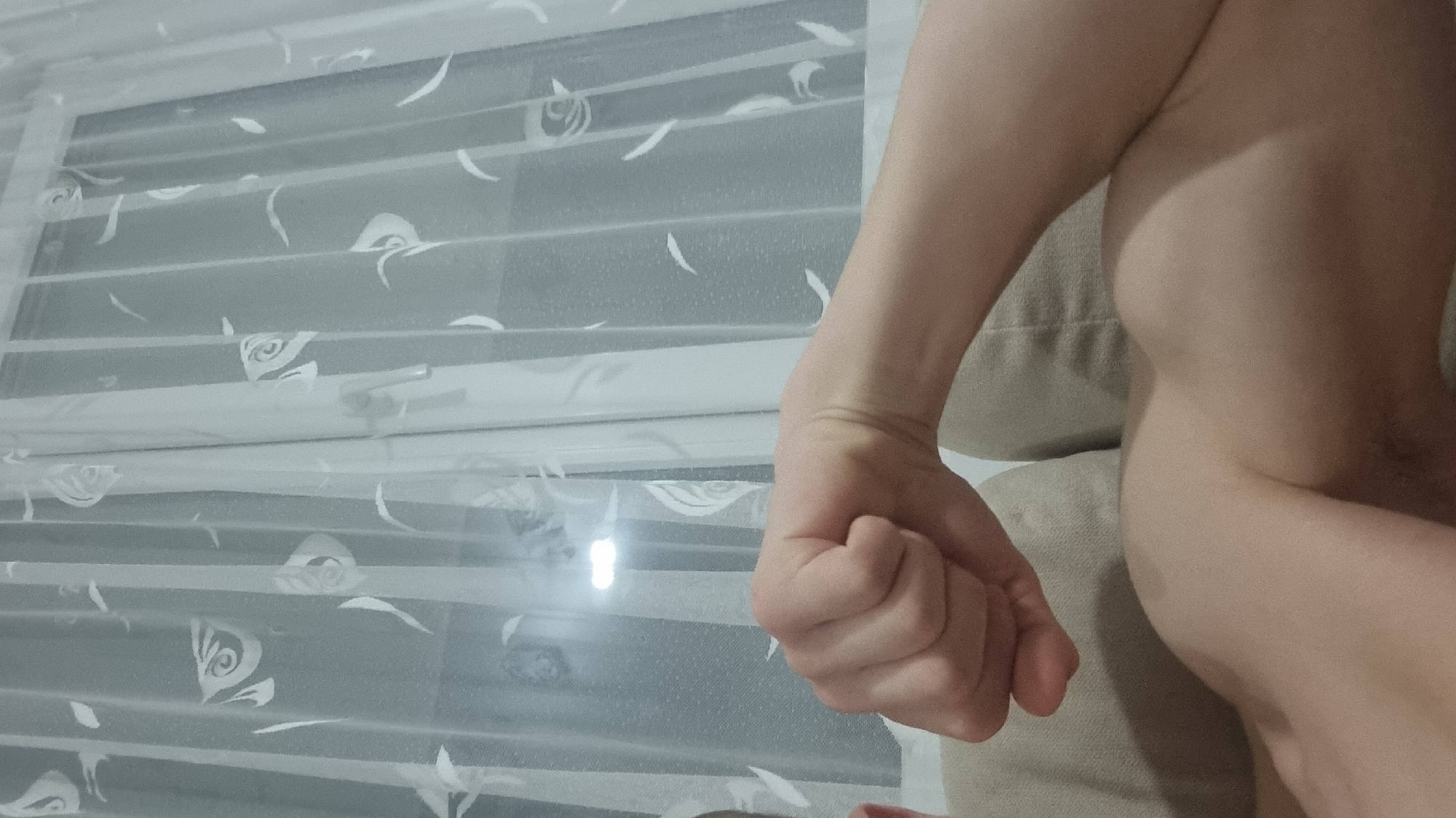 The image depicts the upper left arm and shoulder of a light-skinned individual, seen from a first-person or close-up perspective, situated indoors in Pchelnik, Bulgaria. The individual's left arm is flexed, with the hand clenched into a fist, displaying a tensed bicep. No clothing is visible on the upper torso. The person appears to be reclining on light-colored upholstered furniture, possibly a couch or armchair. In the background, a white-framed window is visible, covered by a sheer white curtain patterned with abstract, stylized organic or floral shapes. A distinct reflection of a bright, unidentified light source is visible on the windowpane through the curtain, positioned to the upper left of the image center. The external environment beyond the window is obscured.