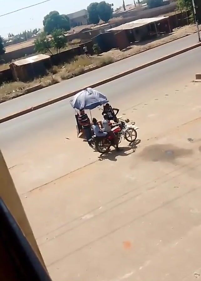 group of people gathered around a motorcycle on a paved surface near a road. Four individuals are visible. One holds a large umbrella, providing shade for the others. Two people are seated on the motorcycle, while another stands nearby. The motorcycle is red and silver. The surrounding environment includes buildings, trees, and a street with a vehicle driving in the distance. The sky is clear and bright, suggesting a sunny day. The view is from an elevated position, possibly from a building overlooking the scene.